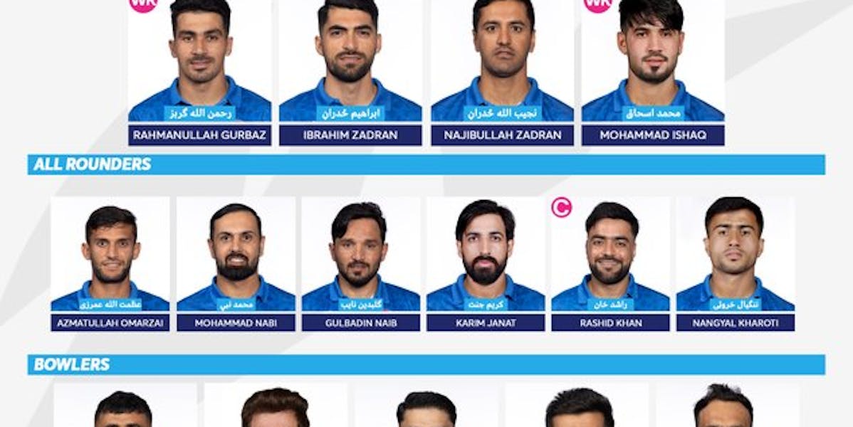 राशिद खान (कप्तान), मोहम्मद नबी, गुलबदीन नईब, अजमतुल्लाह ओमरजई, रहमानुल्लाह गुरबाज़, इब्राहिम ज़दान, नजीबुल्लाह ज़दान, मोहम्मद इशाक, करीम जनत, नूर अहमद, मुजीब उर रहमान, नवीन-उल-हक, फज़ल हक फारूकी, फरीद अहमद मलिक