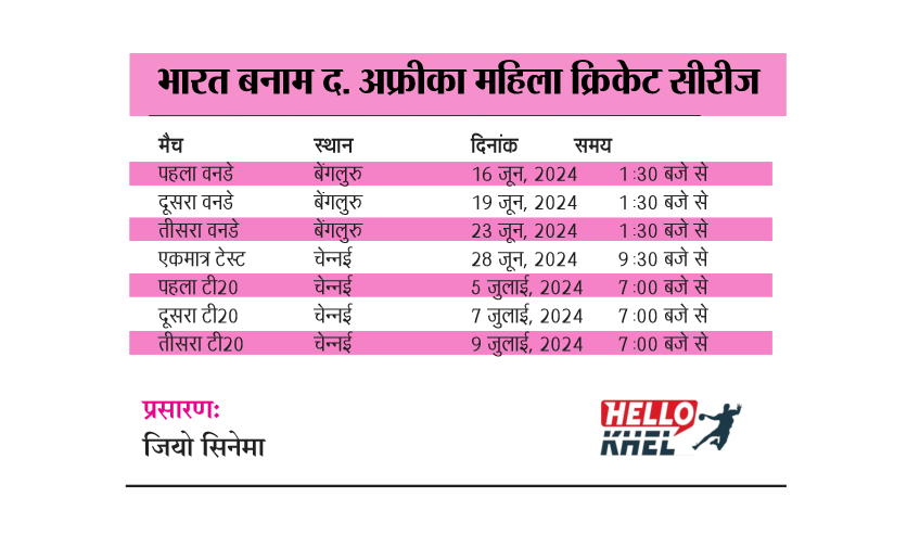 भारत बनाम दक्षिण अफ्रीका महिला क्रिकेट का कार्यक्रम