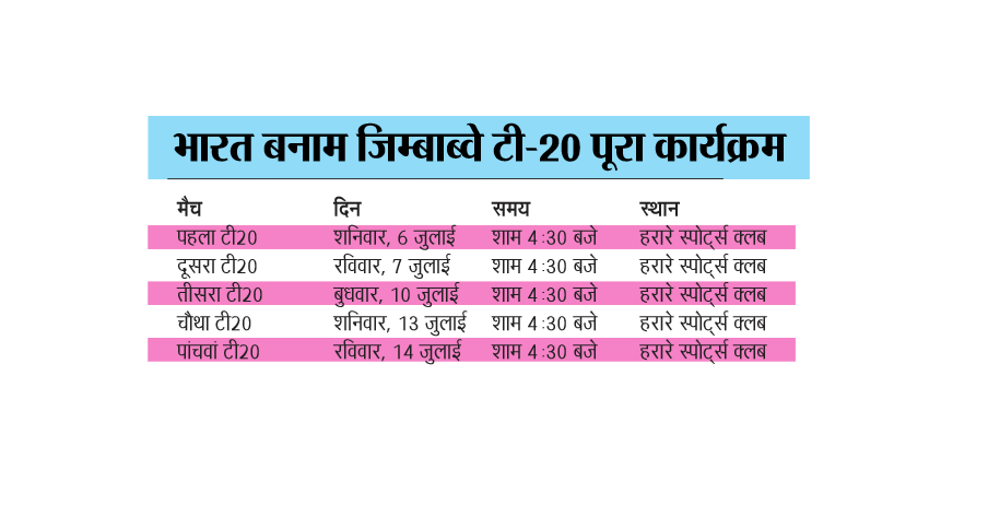 भारत बनाम जिम्बाब्वे टी-20 सीरीज का कार्यक्रम