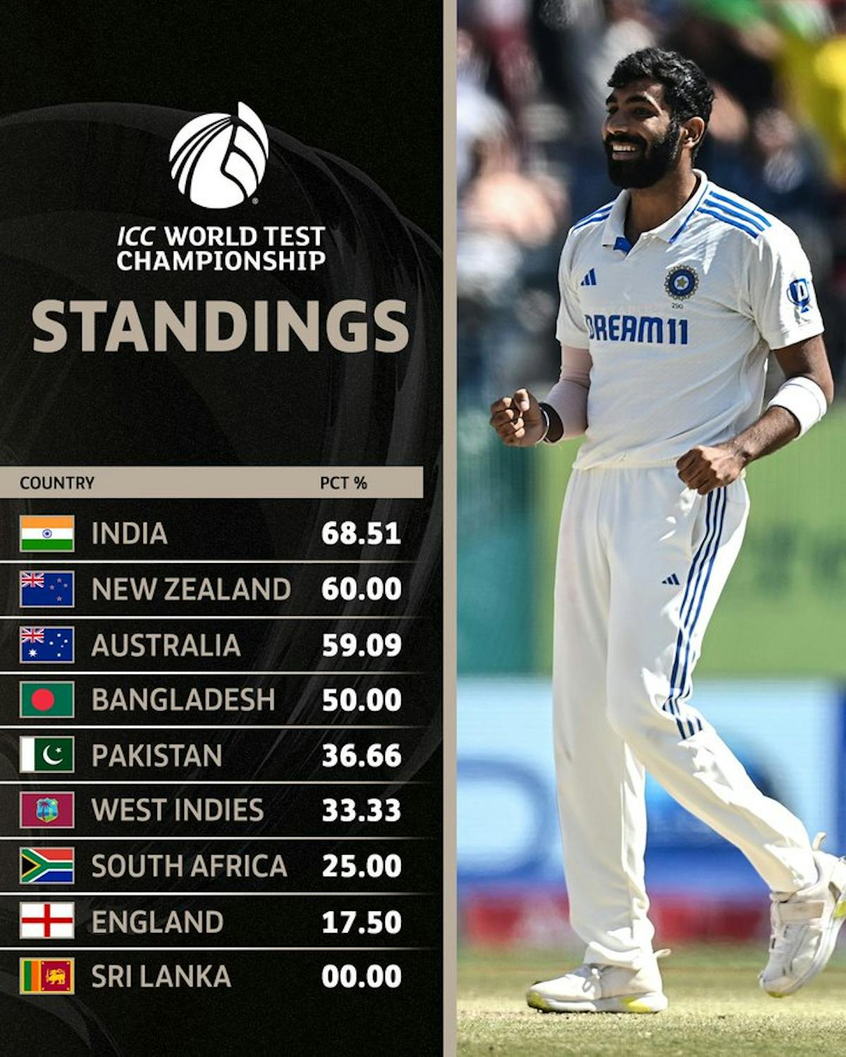 भारत आईसीसी विश्व टेस्ट चैम्पियनशिप स्टैंडिंग तालिका में भी 68.51 अंक प्रतिशत के साथ शीर्ष पर है।
