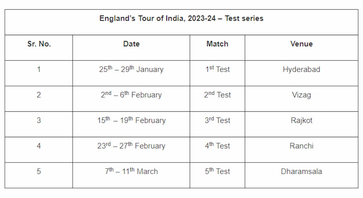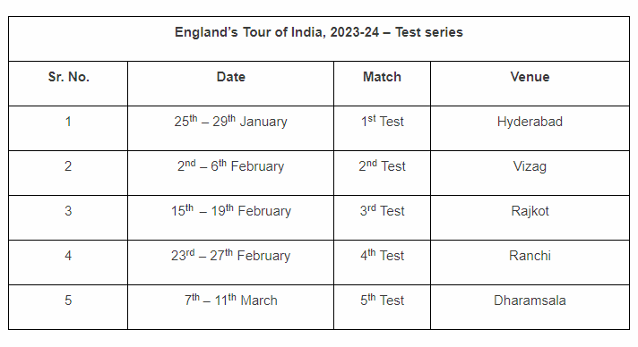इंग्लैंड के साथ टेस्ट सीरीज का कार्यक्रम इस प्रकार है