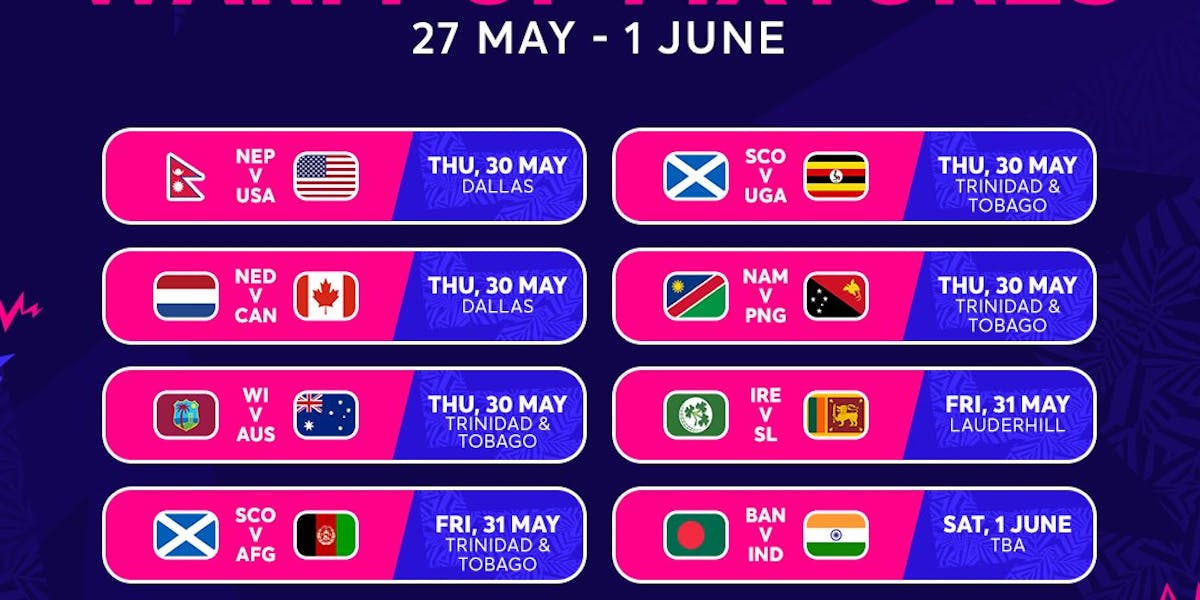 नेपाल v यूएसए, ग्रांड प्रेरी क्रिकेट स्टेडियम, ग्रांड प्रेरी, टेक्सास 21:00 स्कॉटलैंड v युगांडा, ब्रायन लारा क्रिकेट अकादमी, ट्रिनिडाड और टोबैगो 21:00 नीदरलैंड्स v कैनडा, ग्रांड प्रेरी क्रिकेट स्टेडियम, ग्रांड प्रेरी, टेक्सास 01:30 नामीबिया v पापुआ न्यू गिनी, ब्रायन लारा क्रिकेट अकादमी, ट्रिनिडाड और टोबैगो 01:30 वेस्ट इंडीज v ऑस्ट्रेलिया, क्वीन्स पार्क ओवल, ट्रिनिडाड और टोबैगो 05:30