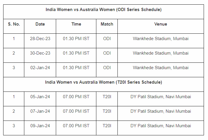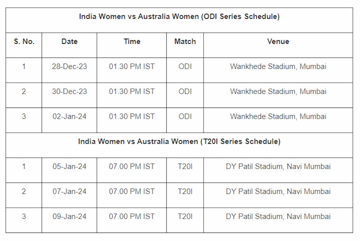 इसके बाद कार्रवाई डीवाई पाटिल, नवी मुंबई में स्थानांतरित हो जाएगी जो क्रमशः 05 जनवरी, 2024, 07 जनवरी, 2024 और 09 जनवरी, 2024 को तीन टी20ई की मेजबानी करेगा।